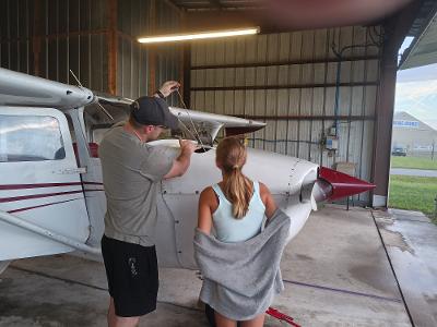 Ivan and Elif cleaning the airplane after a day of flying. Ivan has propeller duty and Elif works on the belly.