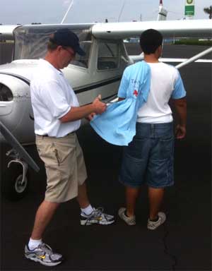 Joel Weaner cuts Ivan's shirt after his first solo on his 16th birthday. Ivan flew solo in 3 different birds on his birthday (PA-17 (Vagabond), C-150, and C-172). FAA regulations require a student pilot be 16 years of age before he can make the first solo flight.