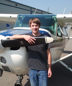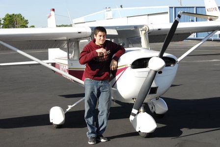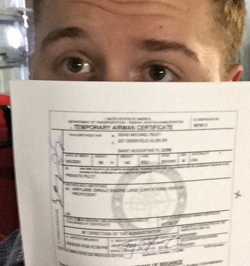 Sean proudly displays his airman certificate after months of study and hard work. Sean began his aviation journey when he was only twelve years of age. Now the sky is the limit.