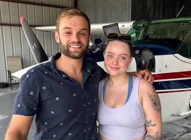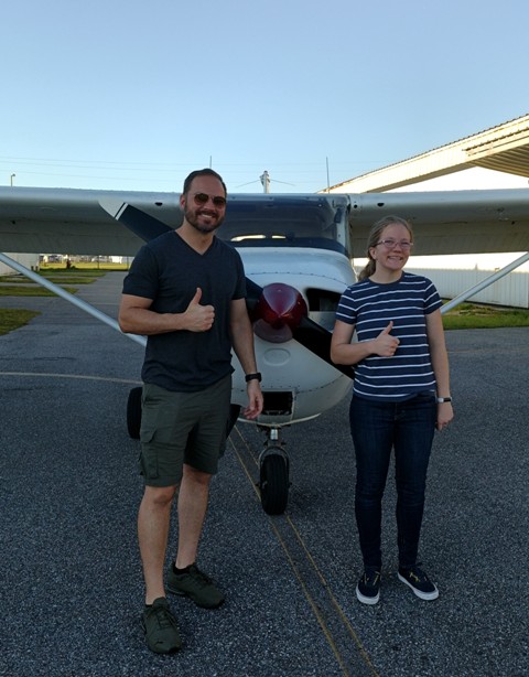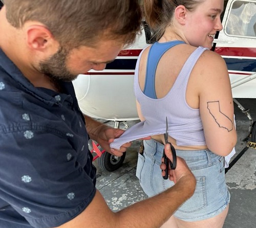 Hailey smiles as her instructor Drew Davies, CFII, removes the back of her shirt indicating he no longer needs to tug on her shirt to get her attention