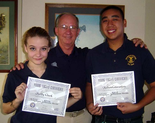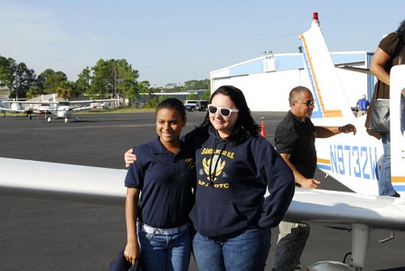 Lt. Colonel Michael Clifton from Sandalwood High School presents flight training awards to Air Force JROTC cadets Shelby Clark and Nelson Cabanatan. Both cadets received their first flight training lesson from Master Instructor Joel Weaner. You can tell they had a good time.