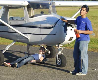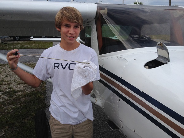 Our newest pilot cadet is Jacob Ridings shown checking the oil in the Cessna 150 during his first preflight and with Chief Instructor Joel Weaner on his first flight. Jacob did an excellent job and will make a fine pilot.