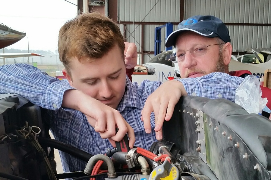 Joel gives Sean a lesson in how to keep the airplane flying safely with proper inspections and maintenance procedures. The mechanics at Corporate Aircraft Maintenance keep our birds in top condition. Safety is our priority.