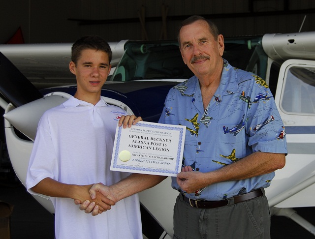 The "General Buckner AK Post 16 Scholarship" provides Jarred all flight training materials and supplies, and all of the flight time and ground school necessary to earn his FAA Private Pilot Certificate. It also covers FAA medical exams and all FAA testing and certification expenses. Jarred is on his way.