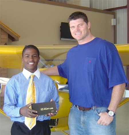 Kristoff named Jacksonville's "Student of the Year" and is congratulated by Kyle Brady for his accomplishment. Hard work and dedication to aviation excellence has paid off for Kristoff. He proudly shows his pilots' logbook to football legend Kyle Brady who is also an accomplished pilot and aircraft owner.